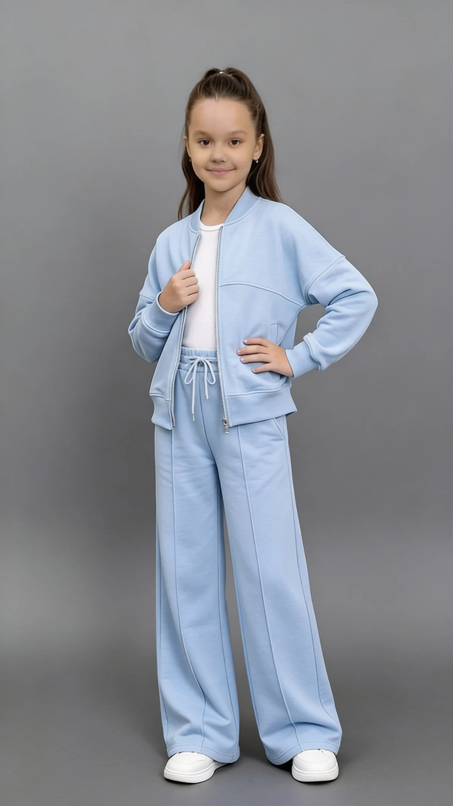 Детский спортивный костюм небесно-голубого цвета изготовлен из трехнитки, обеспечивающей комфорт и свободу движений. Ткань отличается мягкостью, приятной на ощупь, обеспечивая удобство даже при длительном ношении. Такой костюм станет отличным выбором для активного отдыха, занятий спортом и повседневной носки ребенка.